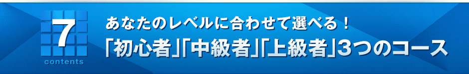 「ビギナーコース」からスタートし、実力が身についたから「スタンダードコース」にステップアップできます。順序良くレベルアップしていくことで無理なく実践することができます。