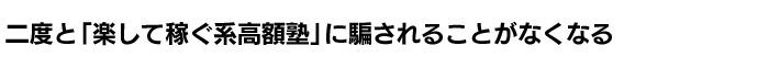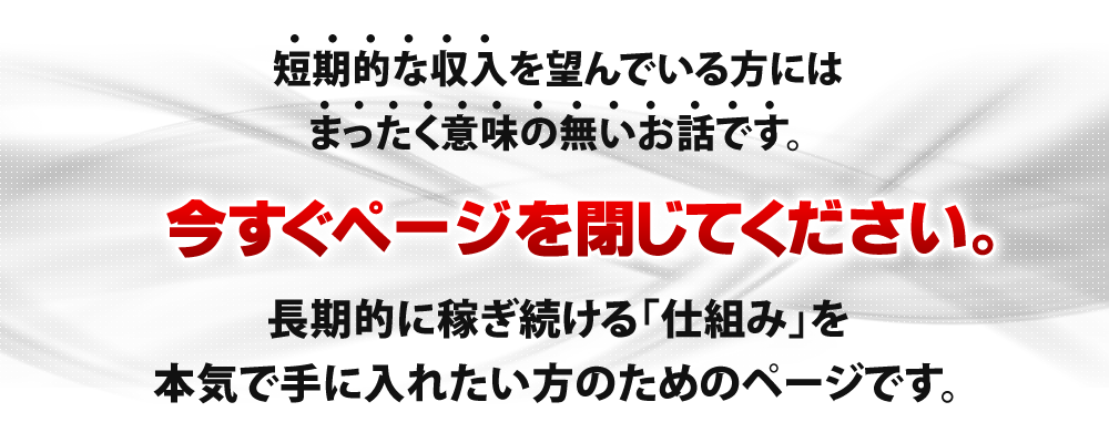 ダウンロードコンテンツという性質上、いかなる理由があろうとも一切返金致しません。また、初めから「返金」を考える後ろ向きの姿勢の人は、私の経験上稼げる可能性がありません。数千万円稼ぐポテンシャルを秘めた本教材を少しでも「高い」と思われるのであれば、購入はご遠慮ください。