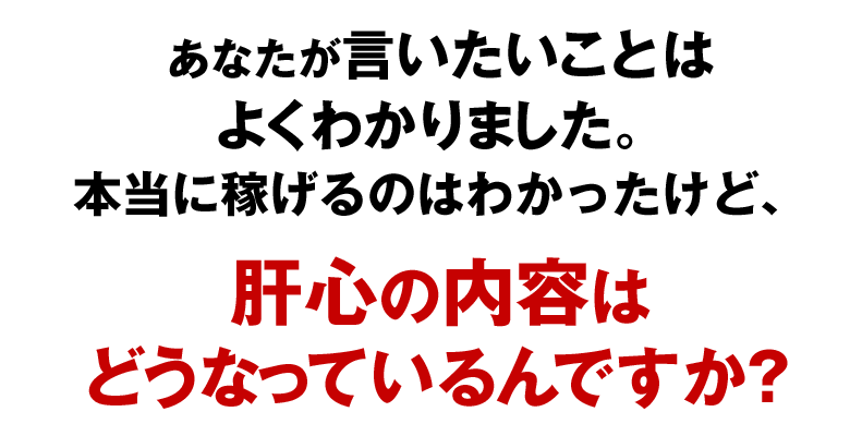 成果に個人差はありますが、科学的に解明されたマーケティングノウハウを解説しておりますので、真面目に実行して全く稼げないということは通常考えられません。ただ、購入しただけで稼げるというものではないことはご理解ください。マニュアルを忠実に実践して初めて、その道が開けます。購入しただけで儲かる可能性があるのは宝くじぐらいでしょう。